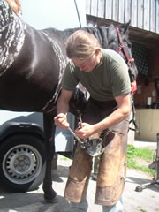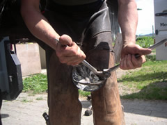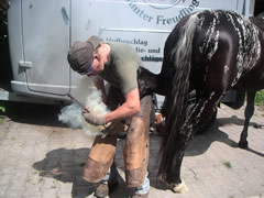 Egal ob Fohlen, Warm- Kalt- oder Vollblüter, ich bearbeite grundsätzlich alle Pferde alleine, ohne Aufhalter. Diese Art des Hufbeschlags ist in ziemlich allen nicht deutschsprachigen Ländern der Welt üblich. Ich sah diese Methode zum ersten Mal bei einem Engländer. Von da an wusste ich, so will ich auch beschlagen. Dies ist nicht nur für das Pferd eine sehr angenehme Methode, sondern kommt auch den Besitzer sehr entgegen. Dieser kann entweder in der Arbeit bleiben oder beim Beschlagen zusehen und seinen Rücken schonen. Fohlen, Pferde die zum ersten Mal beschlagen werden und etwas Kritische binde ich nicht an. Die muss jemand am Strick halten.